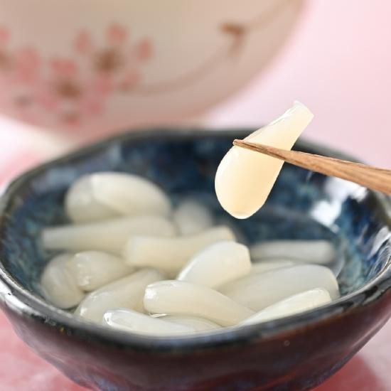 らっきょうには水溶性の食物繊維(フルクタン)が多く含まれており、その含有量はごぼうの約3倍。便秘予防や体内の余分な脂質などを排出する効果があると言われています。また、らっきょうの「におい」の成分である「硫化アリル」は、ビタミンB1の吸収を高め、保温作用があり、身体の冷えに効果的なのだそう。らっきょうを酢漬けにすることでお酢の効能がプラスされ、消化促進や疲労回復にも良いとされます。 酢漬けをそのままいただくのも美味しいですが、ツナやキュウリなどで甘酢和えにしたり、タルタルソースに入れたりするのもおすすめ。刻んでチャーハンに入れると食感のアクセントに。シャキシャキとした心地よい食感をお楽しみください。