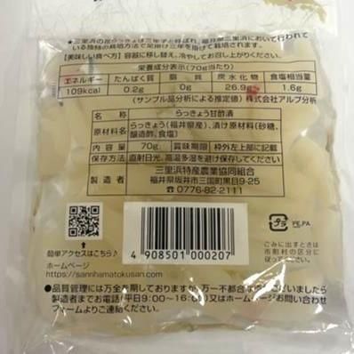 ■名称:らっきょう甘酢漬 ■原材料名:らっきょう (福井県産)、漬け原材料 〔砂糖、 醸造酢、食塩〕 ■内容量: 70g ■保存方法:保存方法 直射日光、高温多湿を避け保存してください ●製造者 : 三里浜特産農業協同組合 福井県坂井市三国町黒目9-25 TEL 0776-82-2111 ●栄養成分表示 (80g当り): エネルギー124kcal、たんぱく質0.3g、脂質0g、炭水化物30.8g、食塩相当量1.8g ●品質管理には万全を期しておりますが、万一不都合な点がございましたら 製造者までお電話(平日9:00~16:00)又はホームページお問い合わせ フォームよりご連絡ください。
