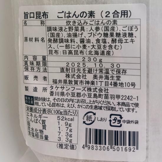 付属する日高昆布と一緒に炊き上げる事で、昆布のうま味が引き出され、上品でとても美味しい炊き込みご飯が手軽に作れます。